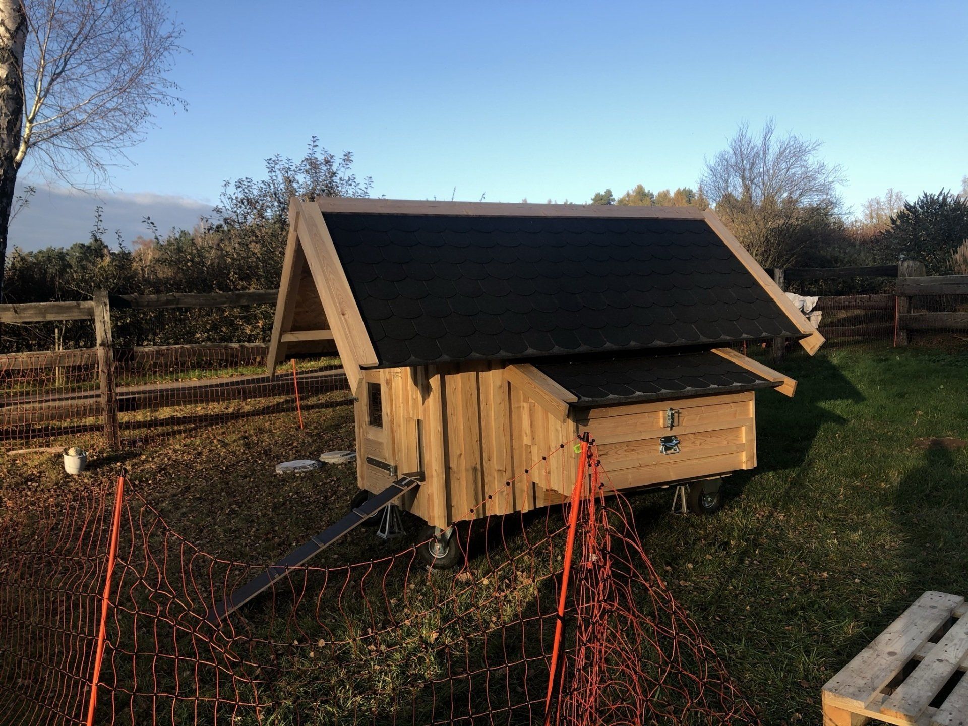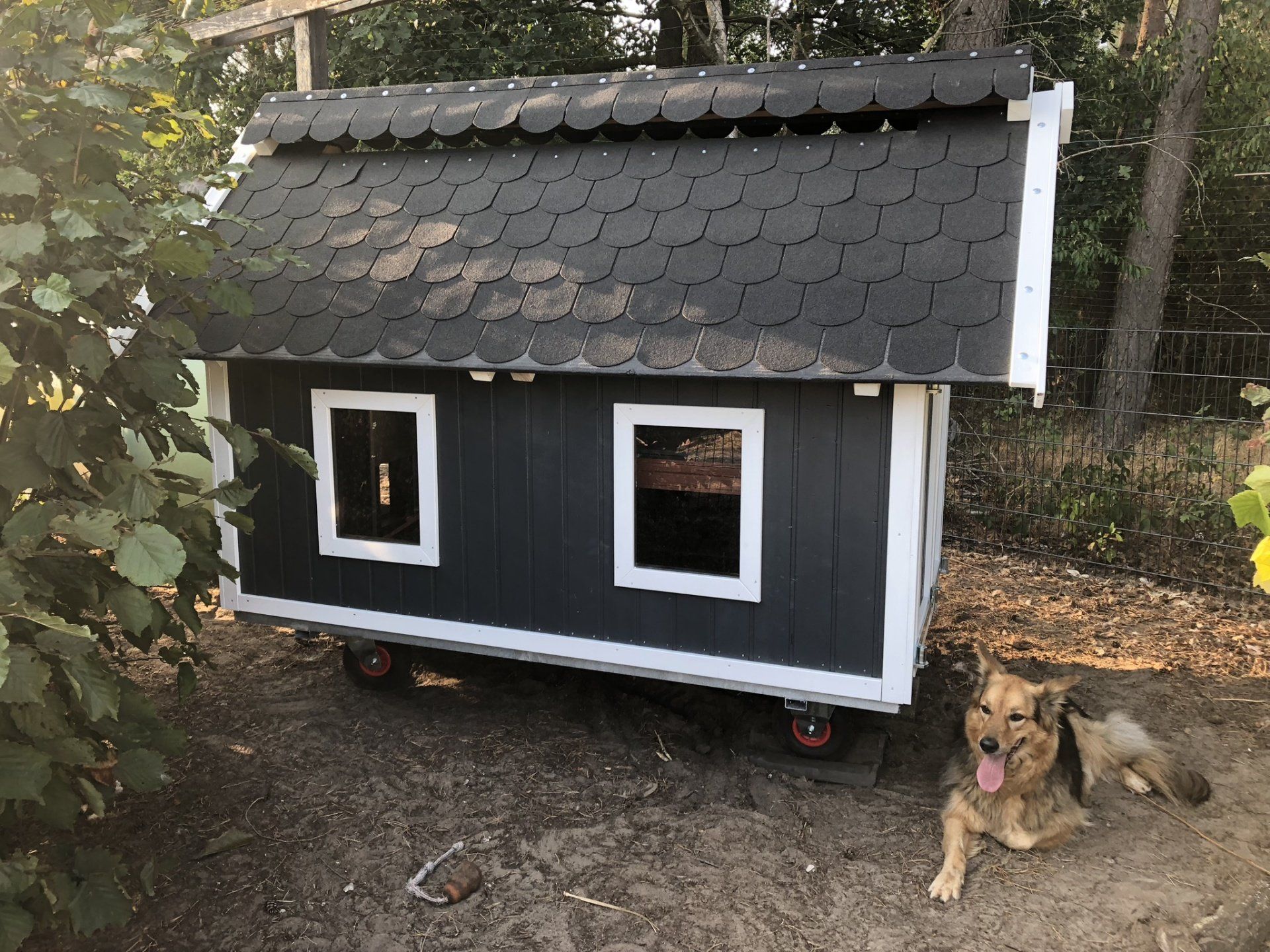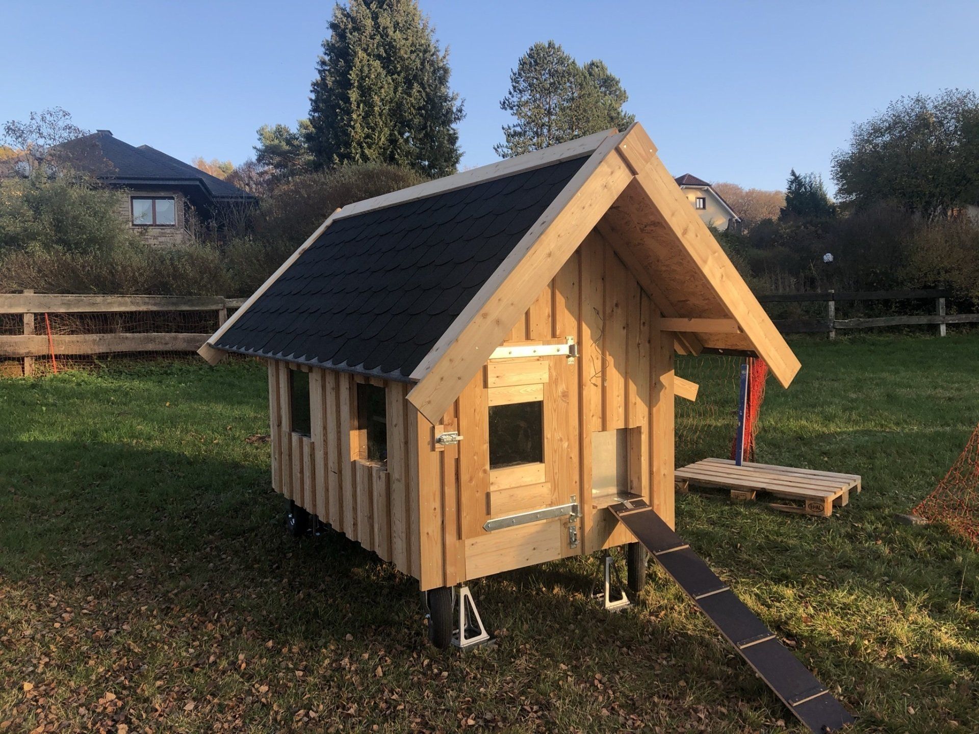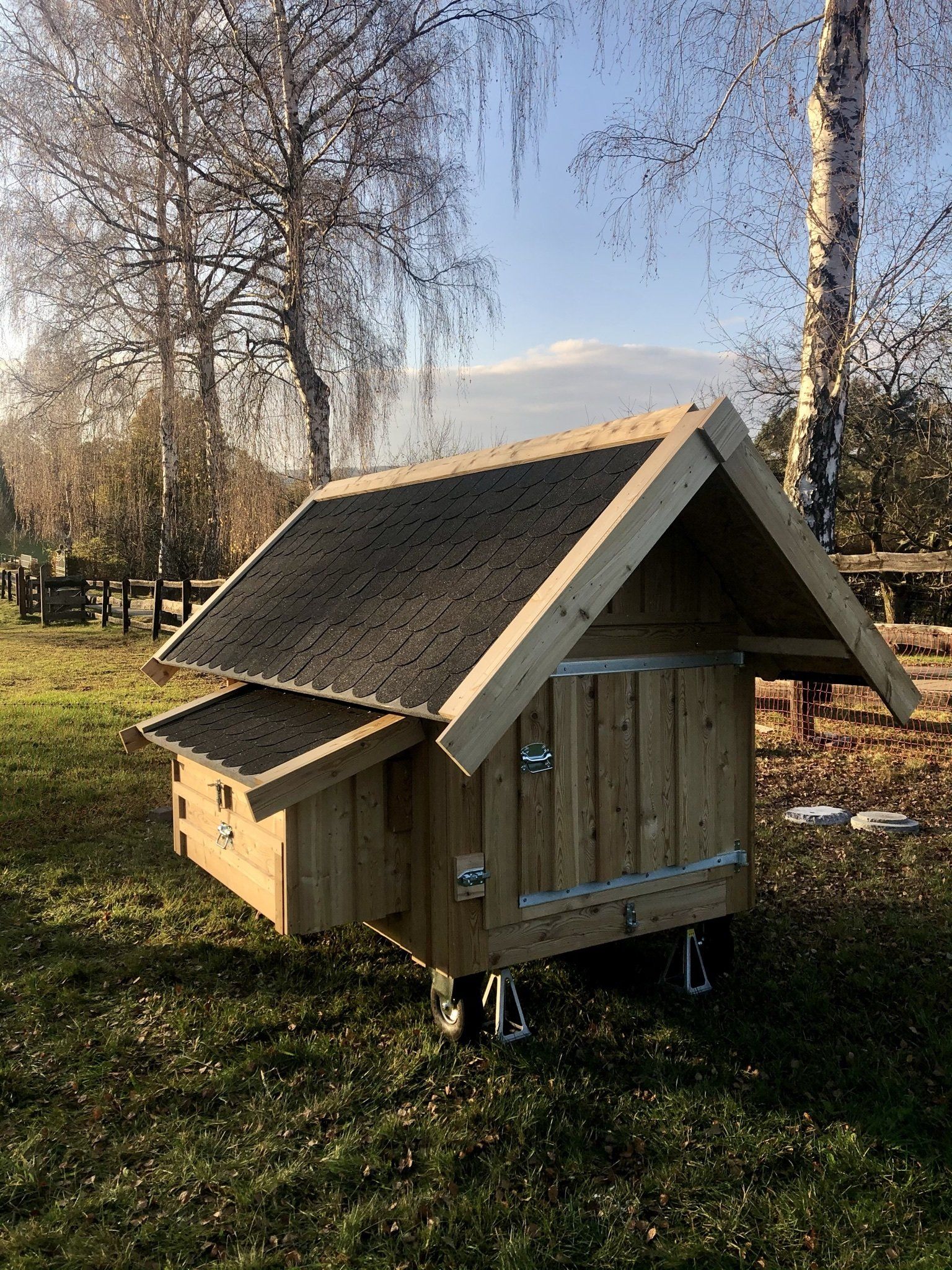 -Das Hühnerhaus Laura steht auf einem Holzrahmen und lässt sich mit Hilfe der 4 Lufträder bewegen